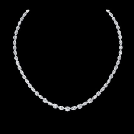 The icy sparkle of round diamonds is beautifully offset by the fiery edge of marquise cuts in this captivating dual-design necklace.